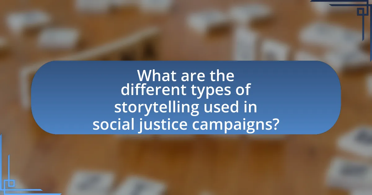 Different types of storytelling used in social justice campaigns include personal narratives, collective stories, data-driven storytelling, and visual storytelling. Personal narratives focus on individual experiences to evoke empathy and connection, as seen in campaigns like “Me Too,” which highlights personal accounts of sexual harassment. Collective stories emphasize shared experiences within communities, fostering solidarity and collective action, such as the narratives used in the Civil Rights Movement. Data-driven storytelling utilizes statistics and research to present compelling arguments for social change, often seen in campaigns addressing issues like climate change or poverty. Visual storytelling employs images, videos, and graphics to convey messages powerfully and memorably, exemplified by campaigns like “Black Lives Matter,” which use striking visuals to raise awareness about racial injustice. Each type serves to engage audiences and drive action toward social justice goals.